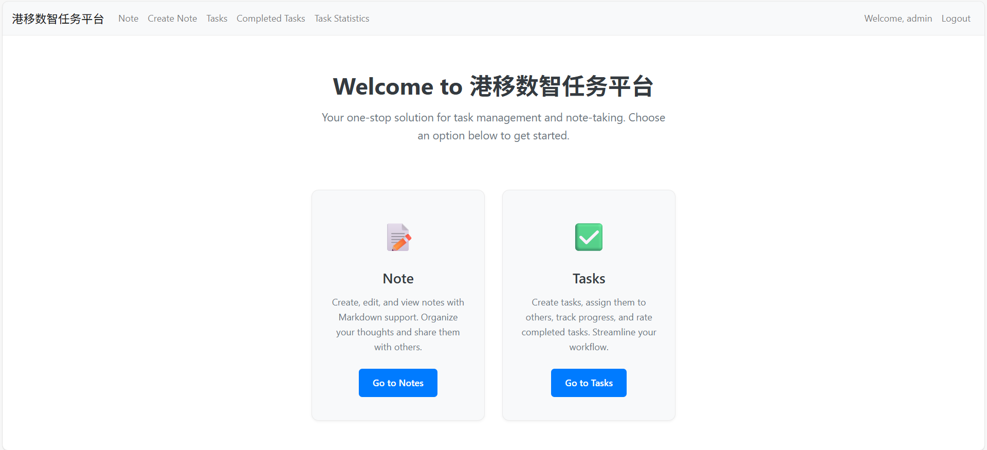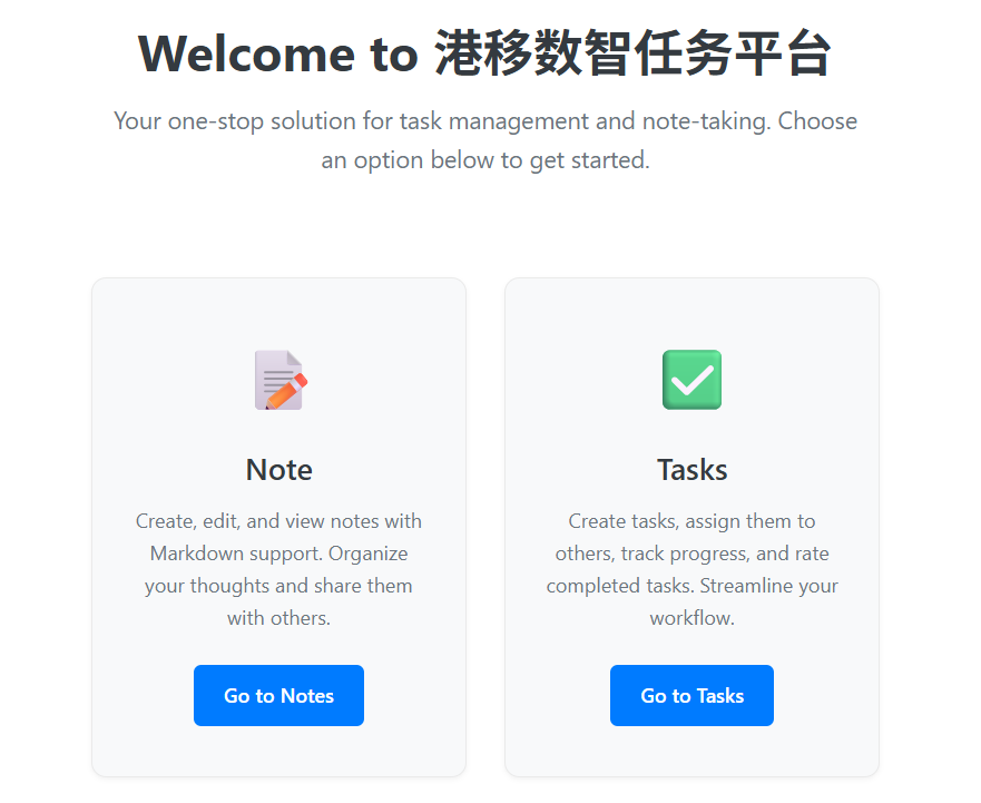 首页包含欢迎提示语、路由选择。Go to Notes按钮,将功能导向笔记功能;Go to Tasks导向任务发布列表