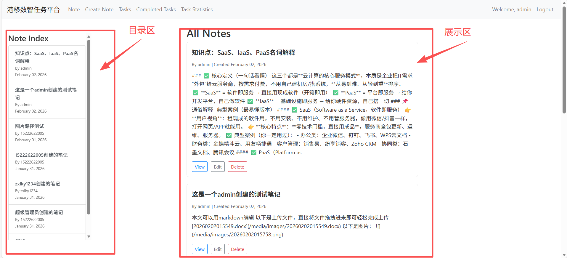 笔记列表,此界面可以查看所有笔记。左侧列表为目录区,展示所有笔记目录,可以快速检索,点击直达笔记;右侧为展示缩略图,可以看到笔记细节图,可以观看(view)、编辑(edit)删除(delete)操作功能。