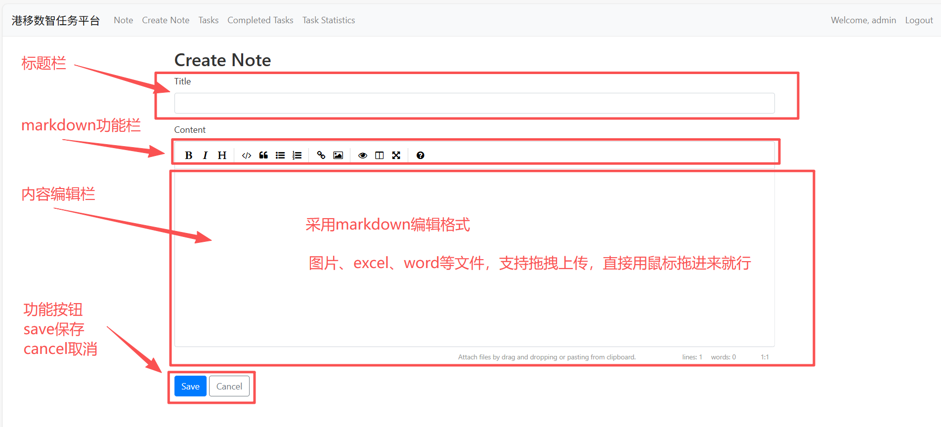 新建笔记功能界面,支持markdown格式编辑。