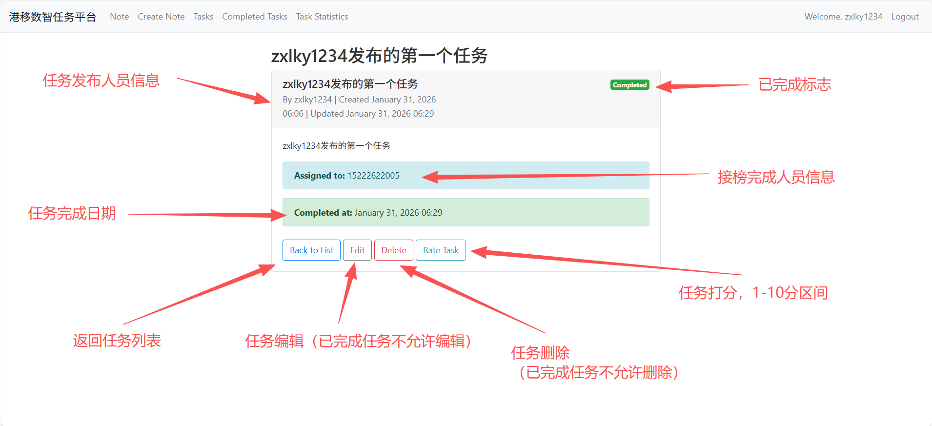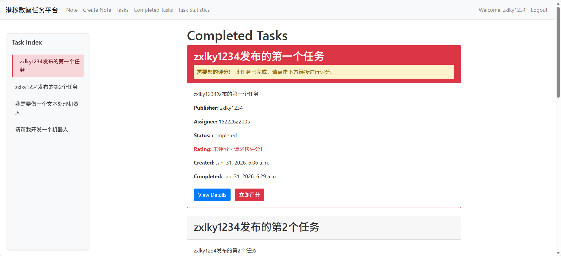 此功能界面是查看已完成给的任务列表,支持所有用户查看。对于用户自己发布的任务,接榜帮人员完成后,发布任务的用户要进行评分。针对与未评分的任务,系统会重点标记。如下图所示,请点击立即评分。👇