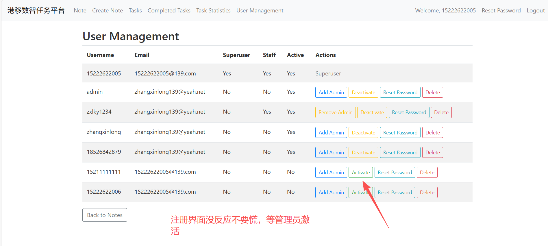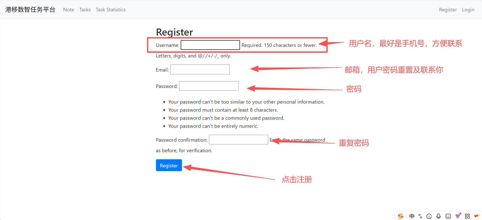 注册界面,点此按钮进行页面注册,点击注册后,等待管理员审核通过即可使用。注册界面没反应不要慌,等管理员审核通过激活账户再使用